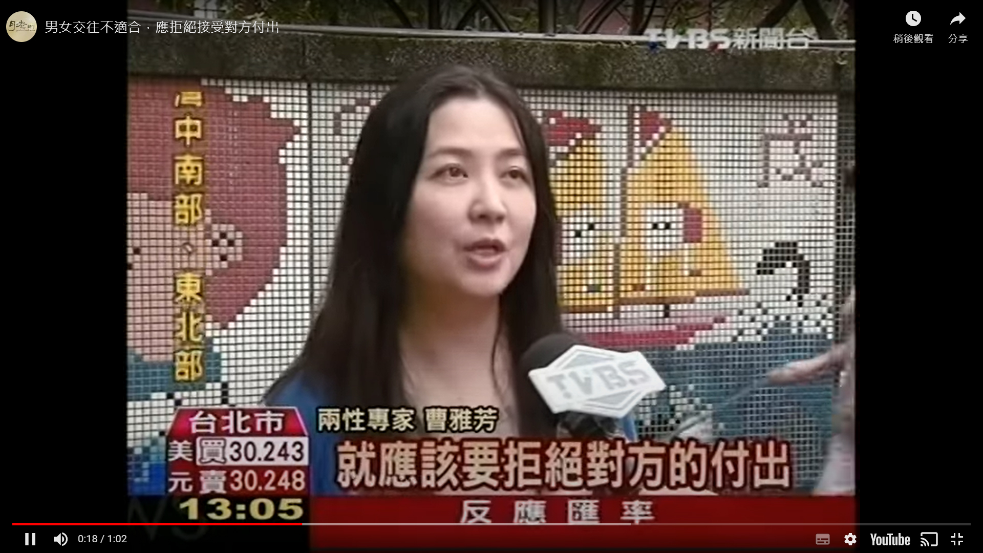 TVBS新聞_2014.09.24 月老銀行公關經理曹雅芳建議:男女交往不適合時,應拒絕接受對方付出,尤其物質方面,以免讓對方存有復合的想像。 ...