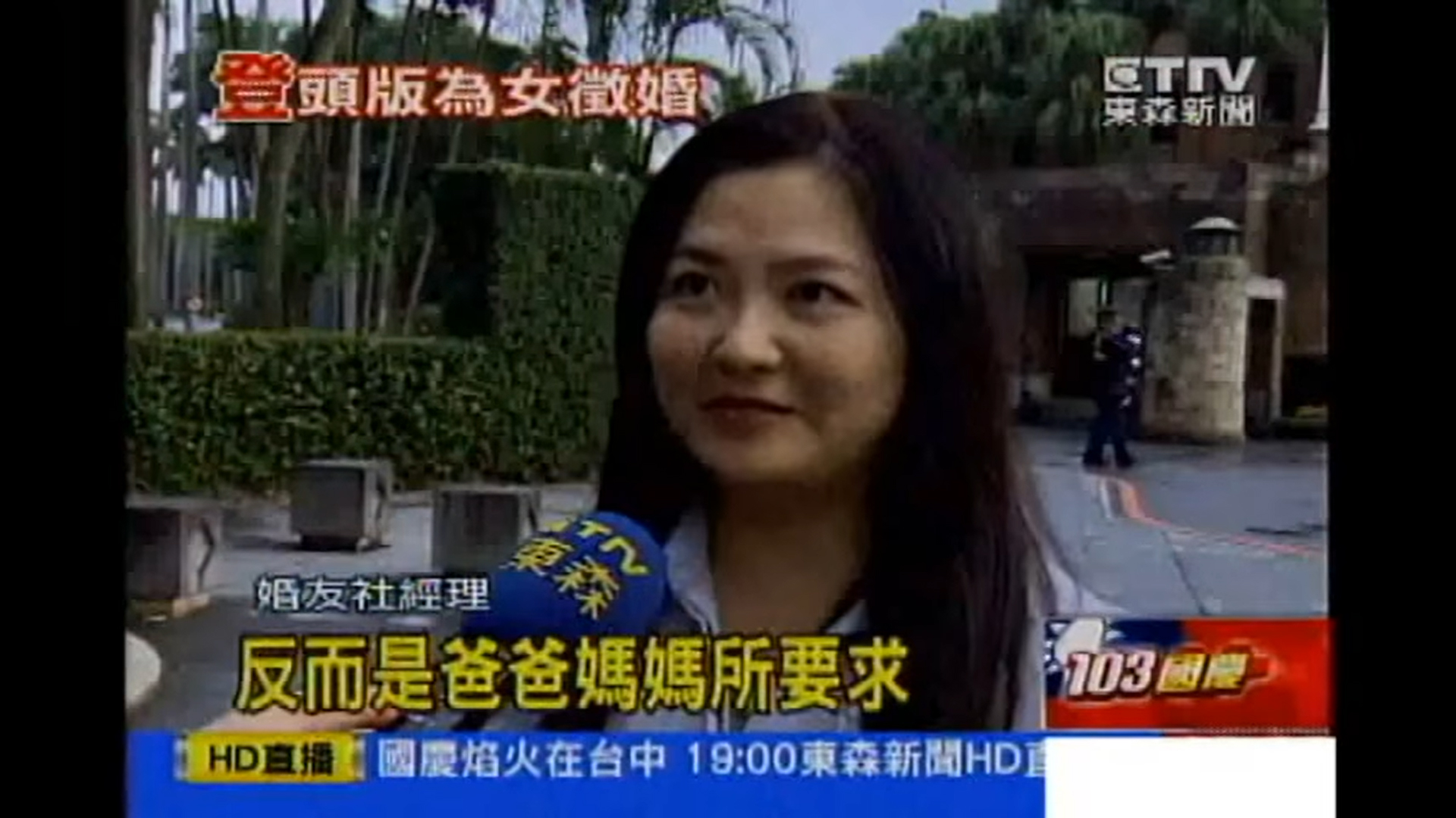 東森新聞_2014.10.10 在報紙頭版刊登徵婚啟事,條件很好,有正當職業還有房產,但是沒看到本人,一般男性還是望之怯步。月老銀行公關經理曹雅芳表示:父母代子女徵婚,有時可能子女根本不知情...
